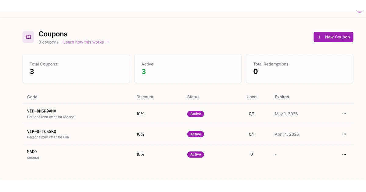 Cap total redemptions or limit to one per client. Run a generous promotion without worrying about it being shared beyond your intended audience.