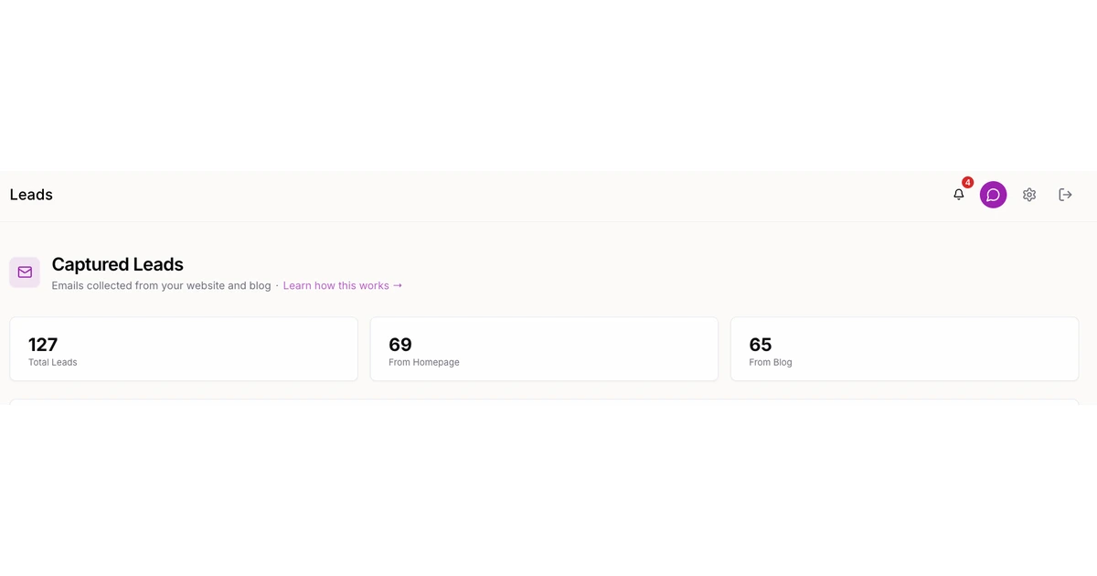Your stats dashboard shows leads by source, conversion rates, and trends over time. Double down on what works, cut what doesn't.